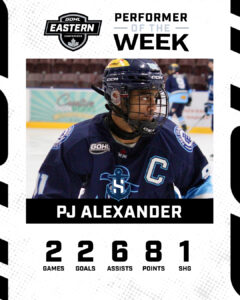 The 3rd-year forward led all GOHL scorers in points for the week, propelling the Sailors (7-5-0-0) to a pair of wins. The Richmond Hill native had a goal and 2 assists in a 4-1 win over Ayr on Friday, then had a career high 5 points (1G, 4A) in Saturday’s 6-3 win in Brantford. PJ leads the Sailors in points (14), assists (9), and his 2 shorthanded goals are tied for most in the league.